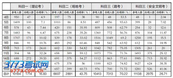 新驾考有4个项目,科目一的理论考、科目二的场地考、科目三的路考和科目三的安全文明驾驶常识考试。新驾考前11天,10184人参加科目一考试,1714人合格,通过率仅为16.83%;6607人参加科目二考试,2891人合格,通过率为43.75%;10143人参加科目三考试,7313人过关,通过率为70.22%;11138人参加科目三安全文明驾驶常识考试,2975人通过(拿到驾照),通过率为26.71%。