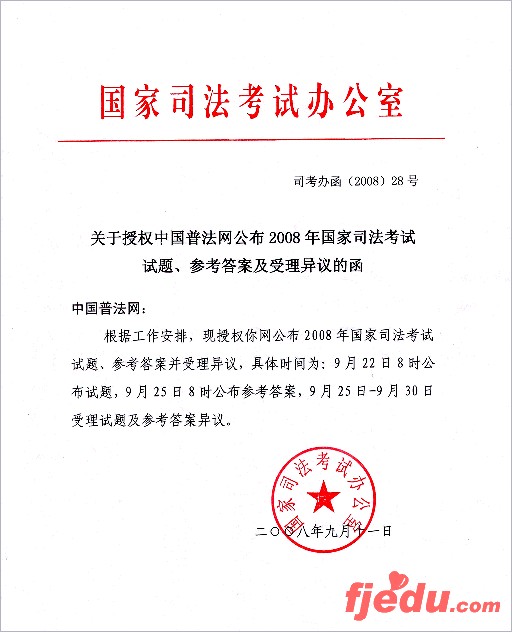 受司法部国家司法考试办公室委托,中国普法网于9月22日8时公布2008年国家司法考试试题,并于9月25日8时公布2008年国家司法考试试题参考答案,同时开通“2008年国家司法考试试题参考答案异议专区”。