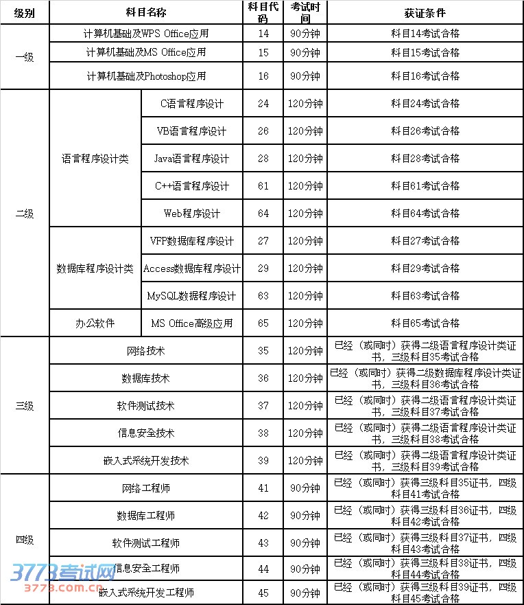 1、报考一级和二级的考生,若成绩合格可直接获得相应证书。报考三级的考生,成绩合格并且已经(或同时)获得二级相应证书方可获得三级证书。报考四级的考生,成绩合格并且已经(或同时)获得三级相应证书方可获得四级证书。