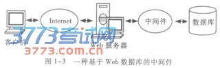 随着Internet的发展,一种基于Web数据库的中间件技术开始得到广泛应用,如图l—3所示。在这种模茧中,Internet Explorer若要访问数据库,则将请求发给Web服务器,再被转移给中 间件,最后送到数据库系统,得到结果后通过中间件、Web服务器返回给浏览器。在这里,中间件是CGI(Comtron Gateway Interface,通用网关接口)、ASP(Active Server Page,动态服务器页面)或JSP(Java Ser、er Page,许多公司参与一起建立的一种动态网页技术标准)等。