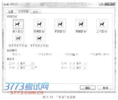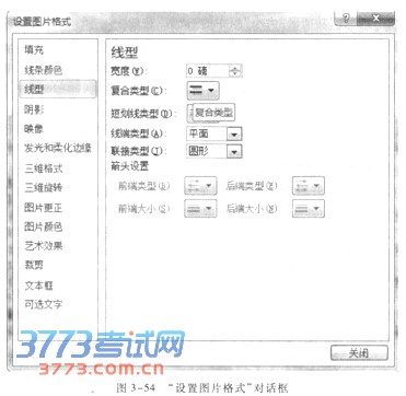 4)为图片添加边框为图片添加边框的操作如下: (1)右键单击选定图片,打开图片设置快捷菜单,单击其中的“设置图片格式”命令,打开图 3-54所示的“设置图片格式”对话框。 (2)执行“设置图片格式”对话框中的“线条颜色”命令,从“无线条”、“实线”、“渐变线”中选择一种。 (3)执行“设置图片格式”对话框中的“线型”命令,并在“宽度”文本框中键人边框线的宽度(单位默认为磅),以及“复合类型”、“短划线类型”、“线端类型”等参数。