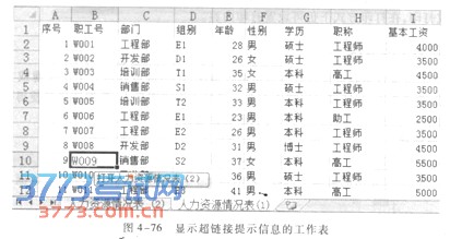 入信息,当鼠标指针放置在建立的超链接位置时,显示相应的提示信息,如“打开人力资源情况表(2)”,单击“确定”按钮即完成,如图4—76所示。