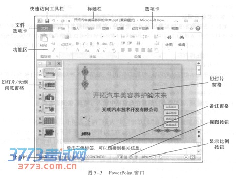 正在编辑演示文稿的PowerPoint窗口如图5—3所示,可以看到,工作界面由快速访问工具栏、标题栏、选项卡、功能区、幻灯片/大纲浏览窗格、幻灯片窗格、备注窗格、状态栏、视图按钮、显示比例按钮等部分组成。