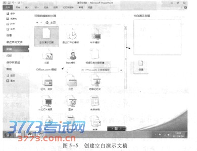创建空白演示文稿有两种方法,第一种是启动PowerPoint时自动创建一个空白演示文稿。第二种方法是在PowerPoint已经启动的情况下,单击“文件”选项卡,在出现的菜单中选择“新建”命令,在右侧“可用的模板和主题”中选择“空白演示文稿”,单击右侧的“创建”按钮即可,如图5—5所示。也可以直接双击“可用的模板和主题”中的“空白演示文稿”。