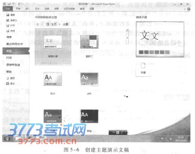 2.用主题创建演示文稿 主题规定了演示文稿的母版、配色、文字格式和效果等设置。使用主题方式,可以简化演示 文稿风格设计的大量工作,快速创建所选主题的演示文稿。 单击“文件”选项卡,在出现的菜单中选择“新建”命令,在右侧“可用的模板和主题”中选择 “主题”,在随后出现的主题列表中选择一个主题,并单击右侧的“创建”按钮即可,如图5—6所示。也可以直接双击主题列表中的某主题。 3.用模板创建演示文稿 模板是预先设计好的演示文稿样本,包括多张幻灯片,表达特定提示内容,而所有幻灯片主 题相同,以保证整个演示文稿外观一致。使用模板方式,可以在系统提供的各式各样的模板中,根据自己需要选用其中一种内容最接近自己需求的模板。由于演示文稿外观效果已经确定,所以只需修改幻灯片内容即可快速创建专业水平的演示文稿。这样可以不必自己设计演示文稿的样式,省时省力,提高工作效率。 单击“文件”选项卡,在出现的菜单中选择“新建”命令,在右侧“可用的模板和主题”中选择“样本模板”,在随后出现的模板列表中选择一个模板,并单击右侧的“创建”按钮即可。也可以直接双击模板列表中所选模板。例如,使用“培训”模板创建的演示文稿含有同 一主题的l9张幻灯片,分别表达“标题”、“新员工定位”、“新工作”、“新环境”等提示内容。只要根据培训实际情况按提示修改、填充内容即可。
