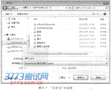 (1)演示文稿制作完成后,通常保存演示文稿的方法是单击快速访问工具栏的“保存”按钮 (也可以单击“文件”选项卡,在下拉菜单中选择“保存”命令),若是第一次保存,将出现如图5—7所示的“另存为”对话框。否则不会出现该对话框,直接按原路径及文件名存盘。
