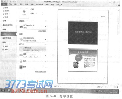 ①打开演示文稿,单击“文件”选项卡,在下拉菜单中选择“打印”命令,右侧各选项可以设置打印份数、打印范围、打印版式、打印顺序等。如图5-8所示。