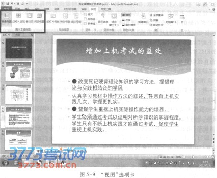 打开“视图”选项卡,在“演示文稿视图”组中有“普通”视图、“幻灯片浏览”视图、“阅读”视图和“备注页”视图命令按钮供选择。单击之,即可切换到相应视图,如图5—9所示。