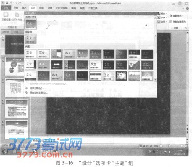 打开演示文稿,单击“设计”选项卡,“主题”组显示了部分主题列表,单击主题列表右下角“其他”按钮,就可以显示全部内置主题供选择,如图5—16所示。鼠标移到某主题,稍后会显示该主题的名称。单击该主题,则系统会按所选主题的颜色、字体和图形外观效果修饰演示文稿。