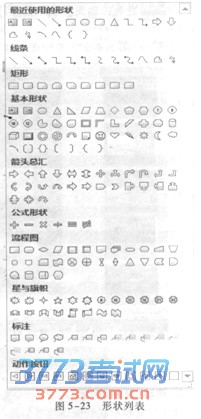 这里以线条、矩形和椭圆为例,说明形状的绘制、移动(复制)和格式化的基本方法,其他形状的用法与Word类似,不再赘述。插入形状有两个途径:在“插入”选项卡“插图”组单击“形状”命令或者在“开始”选项卡“绘图”组单击“形状”列表右下角“其他”按钮,就会出现各类形状的列表,如图5—23所示。