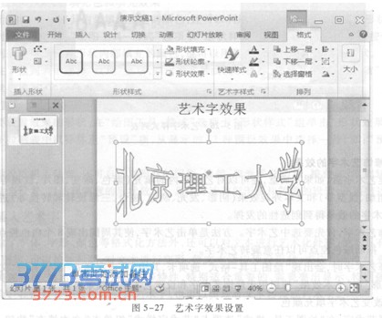 创建艺术字后,如果不满意,还可以对艺术字内的填充(颜色、渐变、图片、纹理等)、轮廓线 (颜色、粗细、线型等)和文本外观效果(阴影、发光、映像、棱台、三维旋转和转换等)进行修饰处理,使艺术字的效果得到创造性的发挥。 修饰艺术字,首先要选中艺术字。方法是单击艺术字,使其周围出现8个白色控点和一个绿 色控点。拖动绿色控点可以任意旋转艺术字。 选择艺术字时,会出现“绘图工具一格式”选项卡,其中“艺术字样式”组含有的“文本填充”、“文本轮廓”和“文本效果”按钮用于修饰艺术字和设置艺术字外观效果。 1)改变艺术字填充颜色 , 选择艺术字,在“绘图工具一格式”选项卡“艺术字样式”组单击“文本填充”按钮,在出现的下拉列表中选择一种颜色,则艺术字内部用该颜色填充。也可以选择用渐变、图片或纹理填充艺 术字。选择列表中的“渐变”命令,在出现的渐变列表中选择一种变体渐变(如“中心辐射”)。选择列表中的“图片”命令,则出现“插入图片”对话框,选择图片后用该图片填充艺术字。选择列表中的“纹理”命令,则出现各种纹理列表,从中选择一种(如“画布”)即可用该纹理填充艺术字。 2)改变艺术字轮廓 为美化艺术字,可以改变艺术字轮廓线的颜色、粗细和线型。选择艺术字,然后在“绘图工具一格式”选项卡“艺术字样式”组单击“文本轮廓”按钮,出现下拉列表,可以选择一种颜色作为艺术字轮廓线颜色。 在下拉列表中选择“粗细”项,出现各种尺寸的线条列表,选择一种(如:l.5磅),则艺术字轮廓采用该尺寸线条。 在下拉列表中选择“虚线”项,可以选择线型(如:“短划线”),则艺术字轮廓采用该线型。 3)改变艺术字的效果 如果对当前艺术字效果不满意,可以以阴影、发光、映像、棱台、三维旋转和转换等方式进行修饰,其中转换可以使艺术字变形为各种弯曲形式,增加艺术感。单击选中艺术字,在“绘图工具一格式”选项卡“艺术字样式”组单击“文本效果”按钮,出现下拉列表,选择其中的各种效果(阴影、发光、映像、棱台、三维旋转和转换)进行设置。以“转换”为例,鼠标移至“转换”项,出现转换方式列表,选择其中一种转换方式,如“弯曲一朝鲜鼓”,艺术 字立即转换成“朝鲜鼓”形式,拖动其中的紫色控点可改变变形幅度。如图5—27所示。