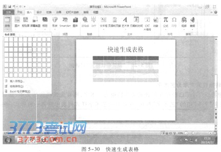 ③单击“确定”按钮,出现一个指定行列的表格,拖动表格的控点可以改变表格的大小,拖动表格边框可以定位表格。行列较少的小型表格也可以快速生成,方法是单击“插入”选项卡“表格”组“表格”按钮,在弹出的下拉列表顶部的示意表格中拖动鼠标,顶部显示当前表格的行列数(如4x6表格),与此同时幻灯片中也同步出现相应行列的表格,直到显示满意行列数时(如6x6表格)单击之,则快速插入相应行列的表格,如图5—30所示。