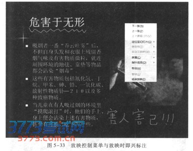 菜单,如图5-33所示。单击“上一张”或“下一张”命令,即可放映当前幻灯片的上一张或下一张幻灯片。若要放映特定幻灯片,将鼠标指针指向放映控制菜单的“定位至幻灯片”,就会弹出所有幻灯片标题,单击目标幻灯片标题,即可从该幻灯片开始放映。