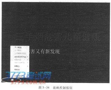 有时希望在放映过程中退出放映,可以右击鼠标,调出放映控制菜单,从中选择“结束放映” 命令即可。 除通过右击调出放映控制菜单外,也可以通过屏幕左下角的控制按钮实现放映控制菜单的全部功能,如图5-34所示。左箭头、右箭头按钮相当于放映控制菜单的“上一张”或“下一张”功能。笔状按钮相当于放映控制菜单的“指针选项”功能。幻灯片状按钮的功能包括放映控制菜单除“指针选项”外的所有功能。
