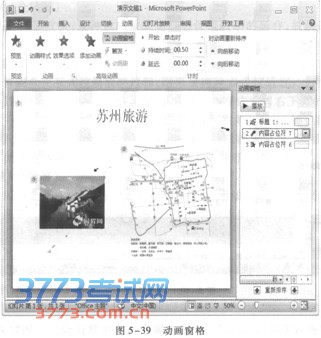 3.调整动画播放顺序 对象添加动画效果后,对象旁边出现该动画播放顺序的序号。一般,该序号与设置动画的顺 序一致,即按设置动画的顺序播放动画。对多个对象设置动画效果后,如果对原有播放顺序不满 意,可以调整对象动画播放顺序,方法如下: 单击“动画”选项卡“高级动画”组的“动画窗格”按钮,调出动画窗格,如图5—39所示。动画窗格显示所有动画对象,它左侧的数字表示该对象动画播放的顺序号,与幻灯片中的动画对象旁边显示的序号一致。选择动画对象,并单击底部的“↑”或“↓”,即可改变该动画对象的播放顺序。 4.预览动画效果