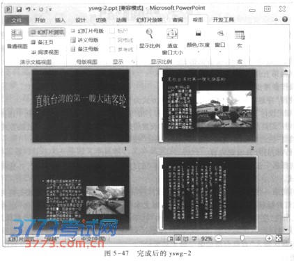 2.操作参考步骤 1)使用“穿越”主题修饰全文,设置放映方式为“观众自行浏览” ①单击“设计”选项卡“主题”组主题列表右下角“其他”按钮,在显示的内置主题中选择“穿越”。 ②单击“幻灯片放映”选项卡“设置”组的“设置幻灯片放映”按钮,出现“设置放映方式”对话框,在“放映类型”栏选择“观众自行浏览”并单击“确定”按钮。 2)插入幻灯片并设置内容 ①选择第一张幻灯片,单击“开始”选项卡“幻灯片”组“新建幻灯片”按钮,并选择“内容与标题”版式。 ②剪切第一张幻灯片的图片,在第二张幻灯片的内容区粘贴。剪切第五张幻灯片文本,在第二张幻灯片标题区下方的文本区粘贴。选择文本区,单击“开始”选项卡“字体”组右下角“字体”按钮,出现“字体”对话框,单击“中文字体”栏下拉按钮,在下拉列表中选择“黑体”。在“大小”栏输入“27”。 ③标题区输入“直航台湾的第一艘大陆客轮”。 3)修改第三张幻灯片 选择第三张幻灯片,单击“开始”选项卡“幻灯片”组“版式”按钮,从版式列表中选择“垂直排列标题与文本”。选择文本,单击“开始”选项卡“段落”组右下角“段落”按钮,出现“段落”对话框,在“行距”栏选择“多倍行距”,然后在“设置值”栏输入“l.1”。在备注区输入文本“两岸海上通航的多个第一”。 4)设置第四张幻灯片并使之成为第三张幻灯片 选择第四张幻灯片的图片,在“动画”选项卡的“动画”组中单击动画样式列表右下角的“其 他”按钮,在下拉列表中选择“旋转”,单击“动画”组右下角“显示其他效果选项”按钮,出现“旋转”对话框,在“计时”选项卡的“期间”栏选择“快速”并单击“确定”按钮。在左侧“幻灯片/大纲”窗格向前拖动第四张幻灯片缩略图,直到第三张幻灯片缩略图前出现竖线,松开鼠标左键。 5)第一张幻灯片插入艺术字 选择第一张幻灯片,单击“插入”选项卡“文本”组“艺术字”按钮,在艺术字样式列表中选择“填充一绿色,强调颜色文字1,金属棱台,映像”并输入“直航台湾的第一艘大陆客轮”。在“绘图工具一 格式”选项卡“艺术字样式”组中单击“文本效果”按钮,从中选择“转换一弯曲一桥形”效果。单击 “绘图工具一格式”选项卡“大小”组右下角“大小和位置”按钮,出现“设置形状格式”对话框,单击左侧的“位置”,在右侧“水平”栏输入“0.9厘米”,“垂直”栏输入“6.3厘米”,单击“关闭”按钮。 6)删除第五张幻灯片 , 在左侧“幻灯片/大纲”窗格选择第五张幻灯片,按删除键。单击快速工具栏的“保存”命令。 完成后的演示文稿如图5—47所示。