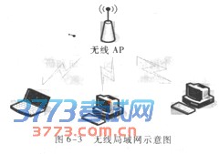 在无线网络的发展史上,从早期的红外线技术,到蓝牙(Bluetooth),都可以无线传输数据,多用于系统互联,但却不能组建局域网。如将一台计算机的各个部件(鼠标、键盘等)连接起来,再如常见的蓝牙耳机。如今新一代的无线网络,不仅仅是简单地将两台计算机相连,更是建立无需布线和使用非常自由的无线局域网WLAN(Wireless LAN)。在WLAN中有许多计算机,每台计算机都有一个无线调制解调器和一个天线,通过该天线,它可以与其他的系统进行通信。通常在室内的墙壁或天花板上也有一个天线,所有机器都与它通信,然后彼此之间就可以相互通信了,如图6—3所示。