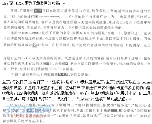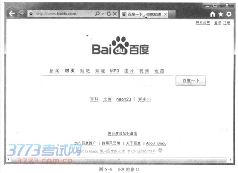 2)IE9的窗口 当启动IE后,首先会发现该浏览器经过简化的设计,界面十分简洁。窗口内会打开一个选项卡,即默认主页。例如,图6-6是百度的页面,可以看出IE9界面上没有以往类似Windows应用程序窗口上的功能按钮,以便用户有更多的空间来浏览网站。