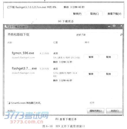 4)保存图片、音频等文件 wwW网页内容是非常丰富的,浏览时除了保存文字信息,还经常会保存一些图片。保存图片的具体操作步骤如下: ①在图片上单击鼠标右键; ②在弹出的菜单上选择“图片另存为”,单击打开“保存图片’,对话框; ③在对话框内选择要保存的路径,键入图片的名称; ④单击“保存”按钮。 因特网上的超链接都指向一个资源,这个资源可以是一个Web页面,也可以是声音文件、视 频文件、压缩文件等文件。要下载保存这些资源,具体操作步骤如下: ①在超链接上单击鼠标右键; ②在弹出的菜单上选择“目标另存为”,单击打开“另存为”对话框; ③在对话框内选择要保存的路径,键入要保存的文件的名称; ④单击“保存”按钮。 在IE9底部会出现一个下载传输状态窗口,如图6—10(a)所示,包括下载完成百分比,估计剩余时间,暂停、取消等控制功能。单击“查看下载”可以打开IE的“查看下载”窗口,如图6—10(b)所示,列出通过IE下载的文件列表,以及它们的状态和保存位置等信息,方便用户查看和跟踪下载的文件。