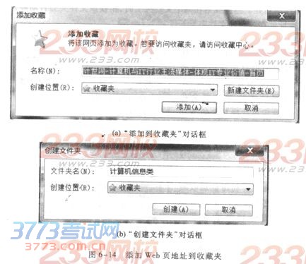 ③单击“添加到收藏夹”按钮 ,打开图6—14(a)所示的“添加收藏”对话框。单击“创建位置”后的下拉框可以展开或收起下面的文件夹。可以单击某个文件夹,选择要保存的位置;