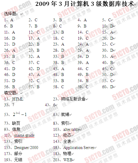 [图文]2009年3月计算机等级三级数据库技术真题答案