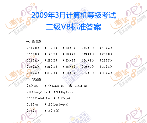 [图文]2009年3月计算机等级二级VB笔试试题答案