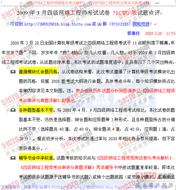 [试题真题][组图]2009年3月计算机等级三级网络技术试卷点评 | 03-28 |