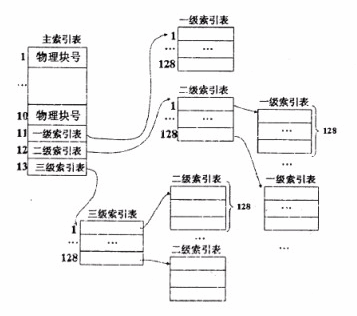 (23)如果某一个文件的物理结构采用的是UNIX的三级索引结构,如图所示。假设一个物理块可以存放128个块号,要查找块号为15000的物理块,需要用到哪一级索引表?