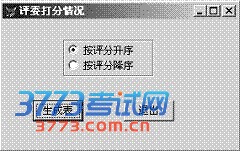 图2 1. 建立一个表单名和文件名均为myform的表单(如图2所示)。表单的标题是"评委打分情况",表单中有两个命令按钮(Command1和Command2)和两个单选钮(Option1和Option2)。Command1和Command2的标题分别是"生成表"和"退出",Option1和Option2的标题分别是"按评分升序"和"按评分降序"。 2. 为"生成表"命令按钮编写程序,程序的功能是根据简单应用题生成的result.dbf表按指定的排序方式生成新的表,单选钮选择"按评分升序"时,依次按最高分、最低分和平均分3个字段升序排序生成表 six_a,单选钮选择"按评分降序"时,依次按最高分、最低分和平均分3个字段降序排序生成表six_d。 3. 运行表单,选择"按评分升序"单选钮,单击"生成表"命令按钮;再选择"按评分降序"单选钮,单击"生成表"命令按钮(注意必须执行)。 基本操作题答案: 4、alter table 评委表 alter 评委编号 set check LEFT(评委编号,2)="11" 简单应用题答案: 2、sele 歌手姓名,max(分数) as 最高分,min(分数) as 最低分,avg(分数) as 平均分 from 歌手表,评分表; where 歌手表.歌手编号=评分表.歌手编号 group by 歌手表.歌手编号 order by 4 desc into table result 综合应用题答案: “生成表”的CLICK事件代码为: DO CASE CASE THISFORM.Optiongroup1.VALUE=1 SELECT * FROM result ORDER BY 最高分,最低分,平均分 INTO TABLE six_a CASE THISFORM.Optiongroup1.VALUE=2 SELECT * FROM result ORDER BY 最高分 DESC,最低分 DESC,平均分 DESC INTO TABLE six_d ENDCASE