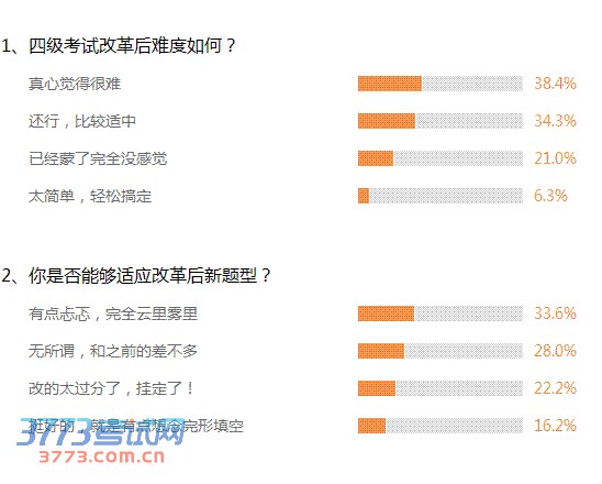 真心觉得很难38.4%5,387票.还行,比较适中34.3%4,806票.已经蒙了完全没感觉21.0%2,953票.太简单,轻松搞定6.3%886票..2、你是否能够适应改革后新题型?