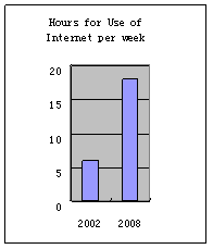 As is displayed in the two charts above, there is a sharp change in (变化)the students’ use of library and Internet(事件)from 2002 to 2008 (时间)in one university of Nanjing(地点)(第一句话通常进行总述). Specifically,(具体描述)The average hours for use of library for study per week(注1) in 2002 was about twenty hours while it declines to about 12 hours per week in 2008. By contrast, there is a fast increase in the average hours for students’ use of Internet for study(注2)at the same period; the average hours increase from about seven hours to about eighteen hours.