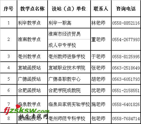 为方便学员学习,我校已在亳州、蒙城、临泉、利辛、淮南、合肥、宣城、广德等地建立了函授站(点),现委托以下函授站点在当地开展2010年招生宣传和生源组织工作,如录取考生达到一定人数,我校将在当地开班上课。(详见下表)。