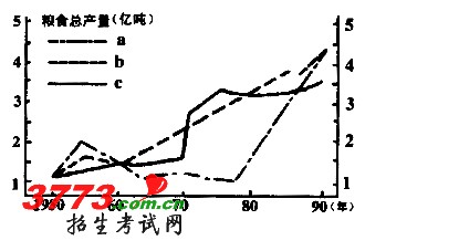 (1)图中的 a、b、c三条折线,正确表示我国1949~1990年粮食总产量增长的是 。