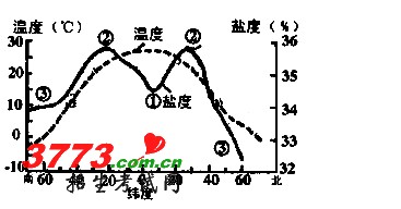 42.分析海洋表面平均盐度和温度按纬度分布的曲线图回答下列问题(10分)