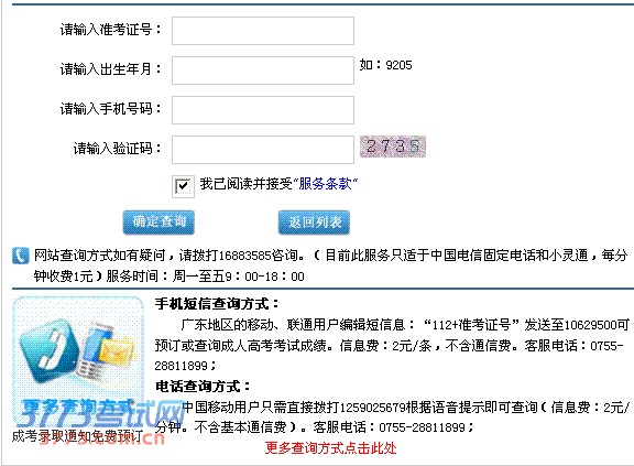 广东地区的移动、联通用户编辑短信息:“112+准考证号”发送至10629500可预订或查询成人高考考试成绩。信息费:2元/条,不含通信费。客服电话:0755-28811899;