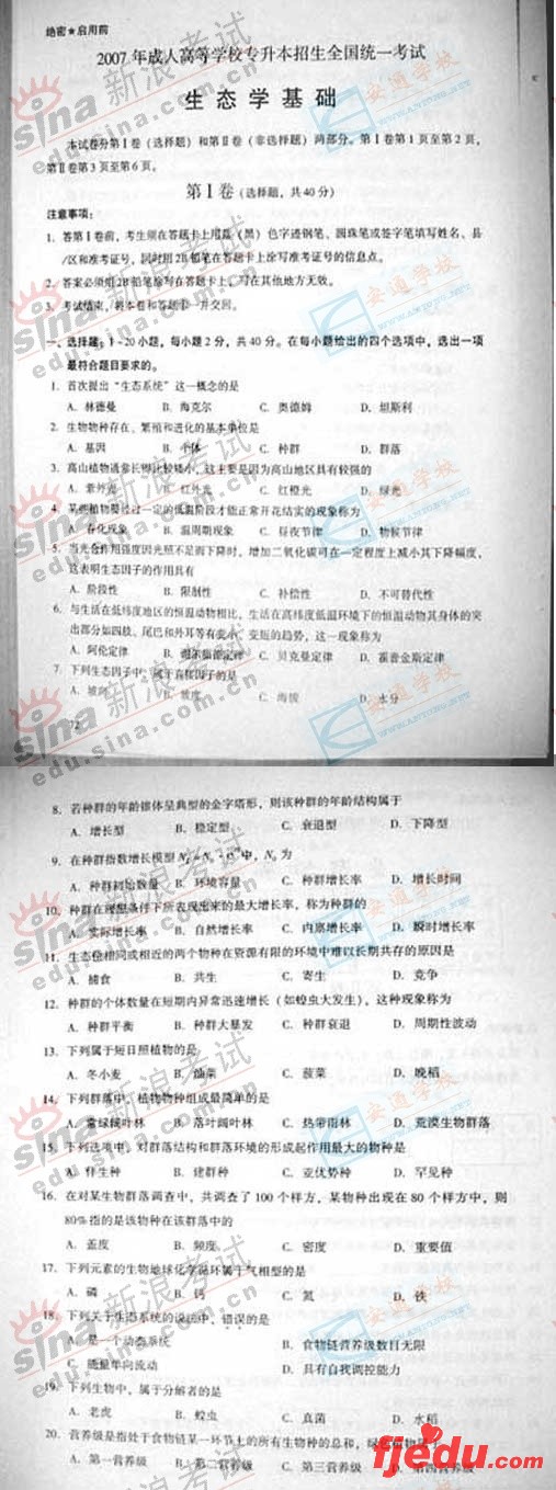 [组图]2007年成人高考专升本生态学基础试题及答案