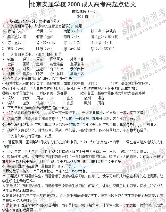 [组图]2008年成人高考高起点语文试题答案(模拟)