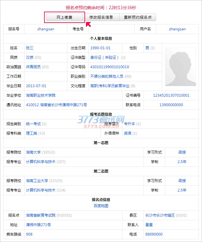 6、认真核对报名信息,确认无误后,点击“网上缴费”按钮进行缴费。如果报名信息有误可点击“修改报名信息”进行修改。