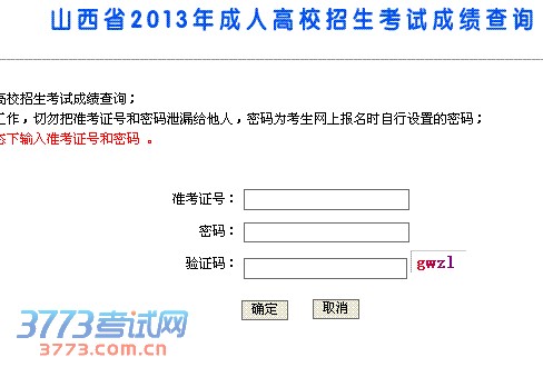 登录山西招生考试网http://www.sxkszx.cn),进入左边的“各类教育招生考试信息管理与服务平台”,点击“成人高考”,进入“2013年成人高考录取查询”页面,输入本人准考证号、密码及系统随机提供的验证码,然后点击“查询”按钮即可查询。