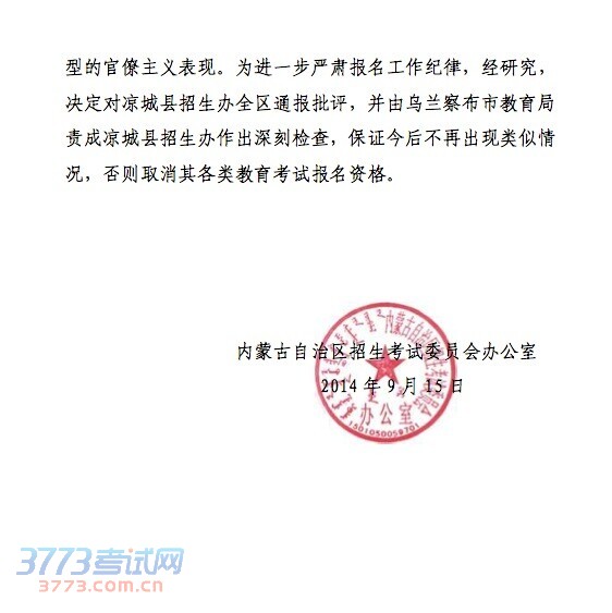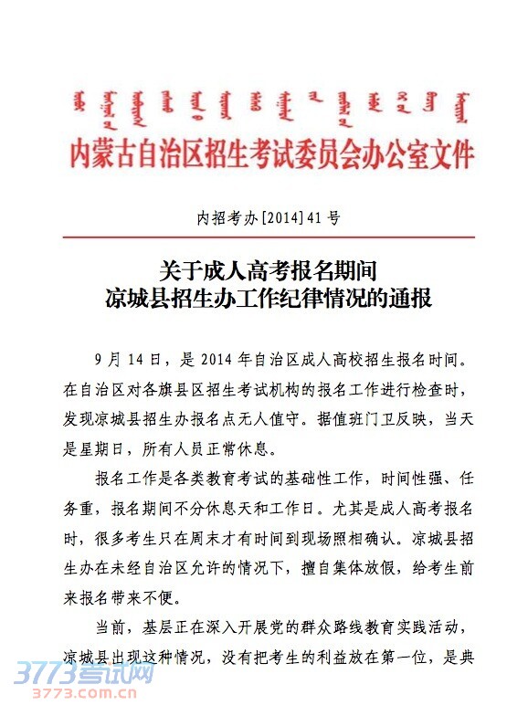 [组图]2014内蒙古成人高考报名期间凉城县招生办工作纪律情况的通报
