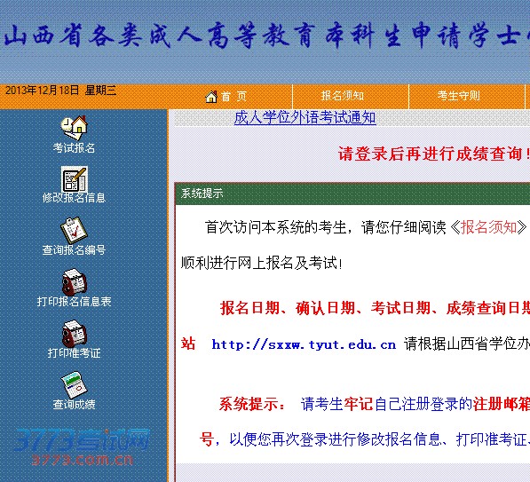 1、请考生于2013年12月17日——2014年1月16日登录查询网站http://115.24.12.8:8080/sxxwwy/index.jsp查询考试成绩,合格分数为60分。