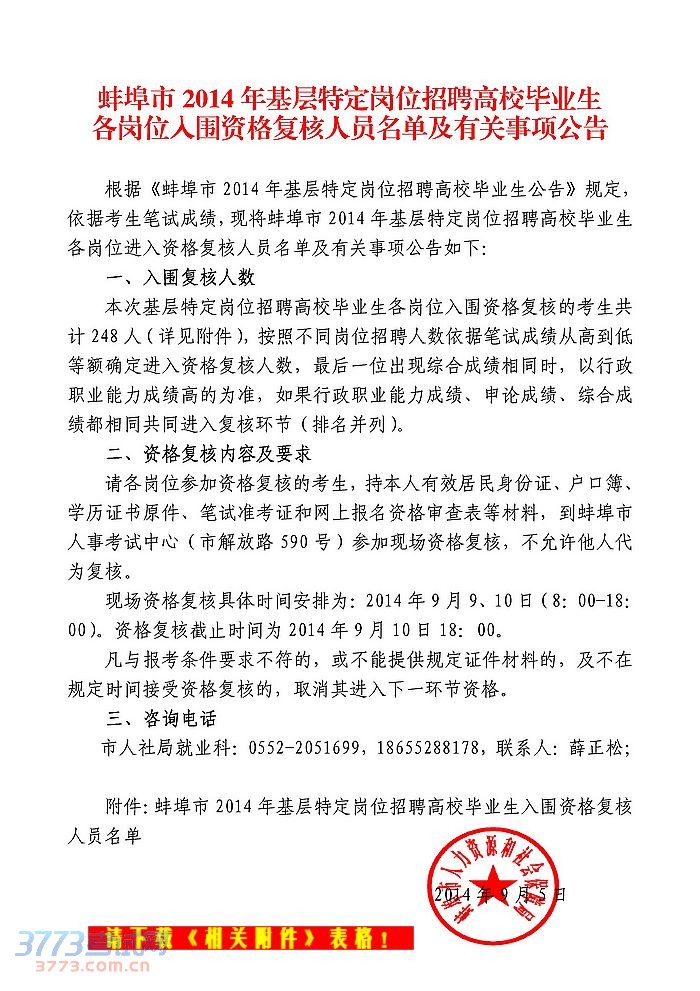 [组图]安徽蚌埠市2014年基层特定岗位招聘入围资格复核名单