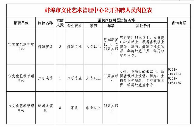 [图文]安徽蚌埠市文化艺术管理中心2015年招聘人员岗位表