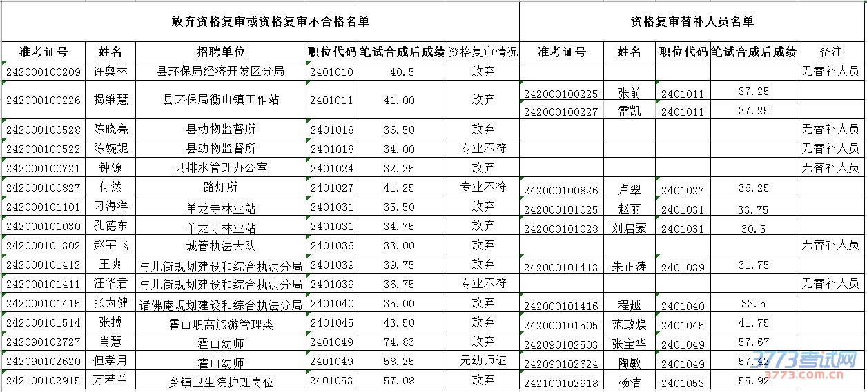 根据2015年霍山县部分事业单位公开招聘工作人员公告规定,现将放弃资格复审、资格复审不合格人员及递补人员名单公布如下,请替补人员携带报名资格审查表、笔试准考证、毕业证书、身份证及报考职位需要提供的资格证书原件及复印件,一寸照片3张,于7月2号到霍山县人社局(地点:霍山县住建大厦9楼)参加资格复审,不按时参加替补资格复审者视为放弃。