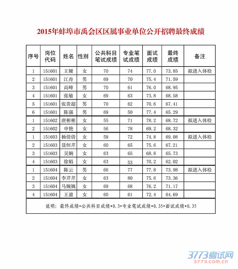 [图文]2015年安徽蚌埠市禹会区区属事业单位招聘最终成绩