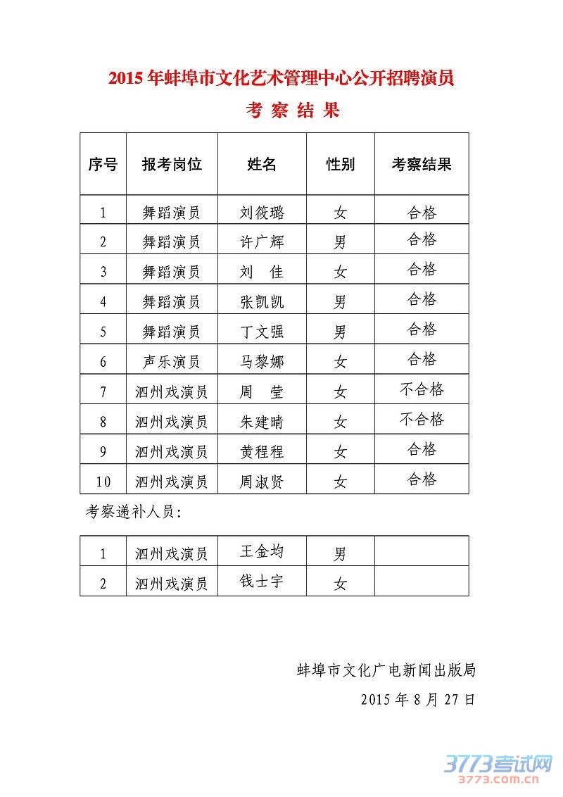 [图文]2015年安徽蚌埠市文化艺术管理中心招聘演员考察结果
