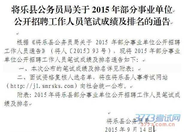 [图文]福建将乐县事业单位2015招聘笔试成绩及排名通知