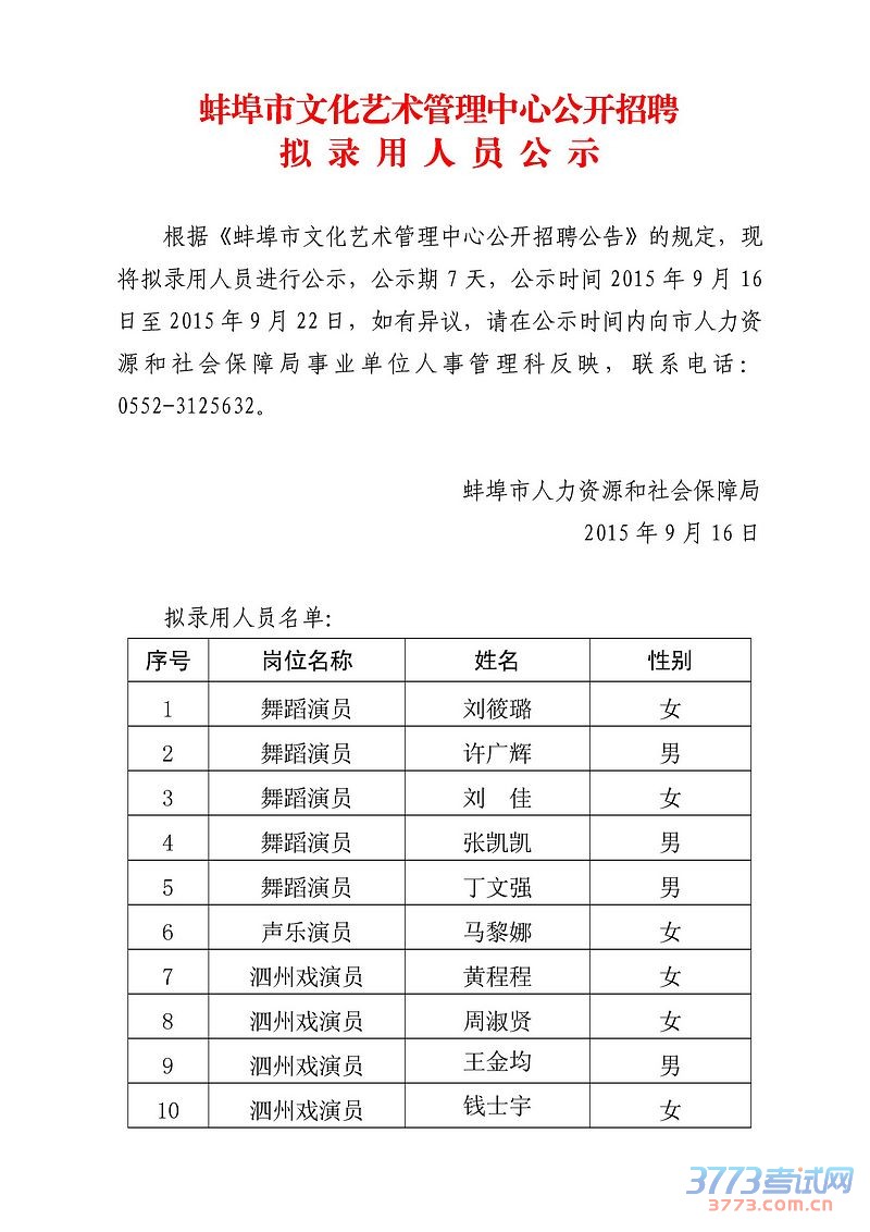 [图文]2015年安徽蚌埠市文化艺术管理中心拟录用名单