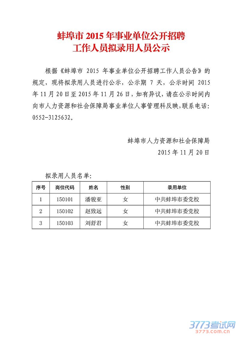 [图文]2015安徽蚌埠市事业单位招聘拟录用名单公示(三)