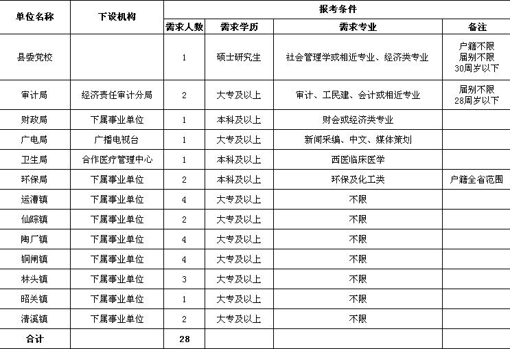 一、招聘名额、范围和条件 1、招聘名额:28名。其中县直机关二级事业单位8名,镇级二级事业单位20名。